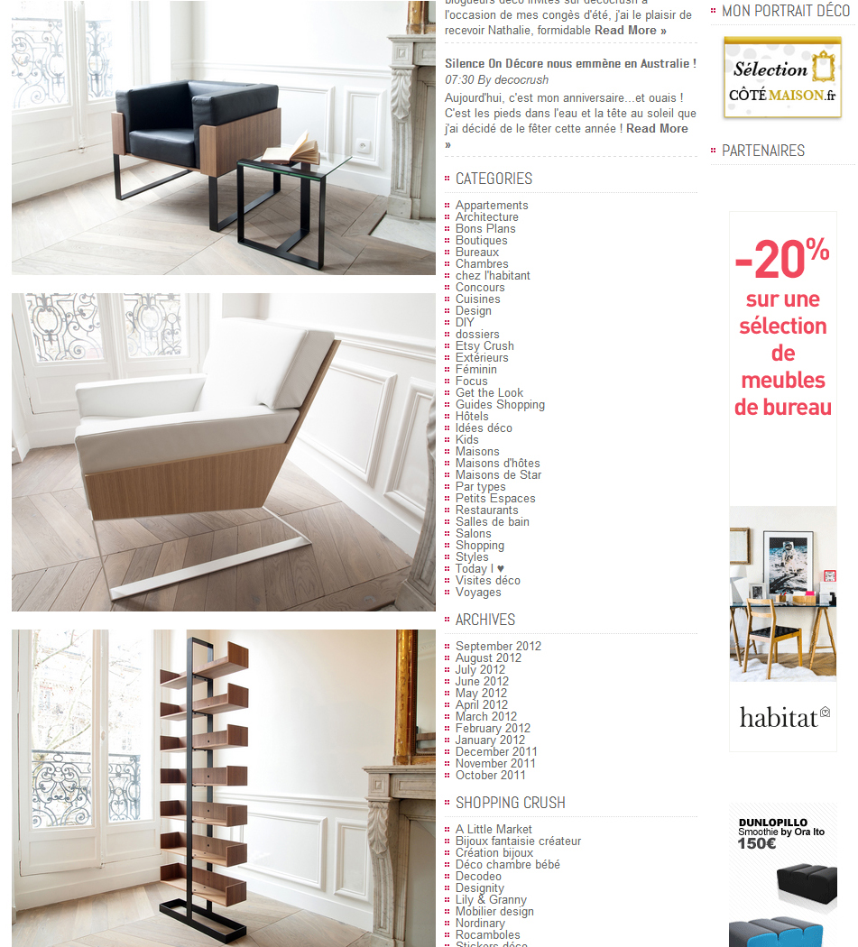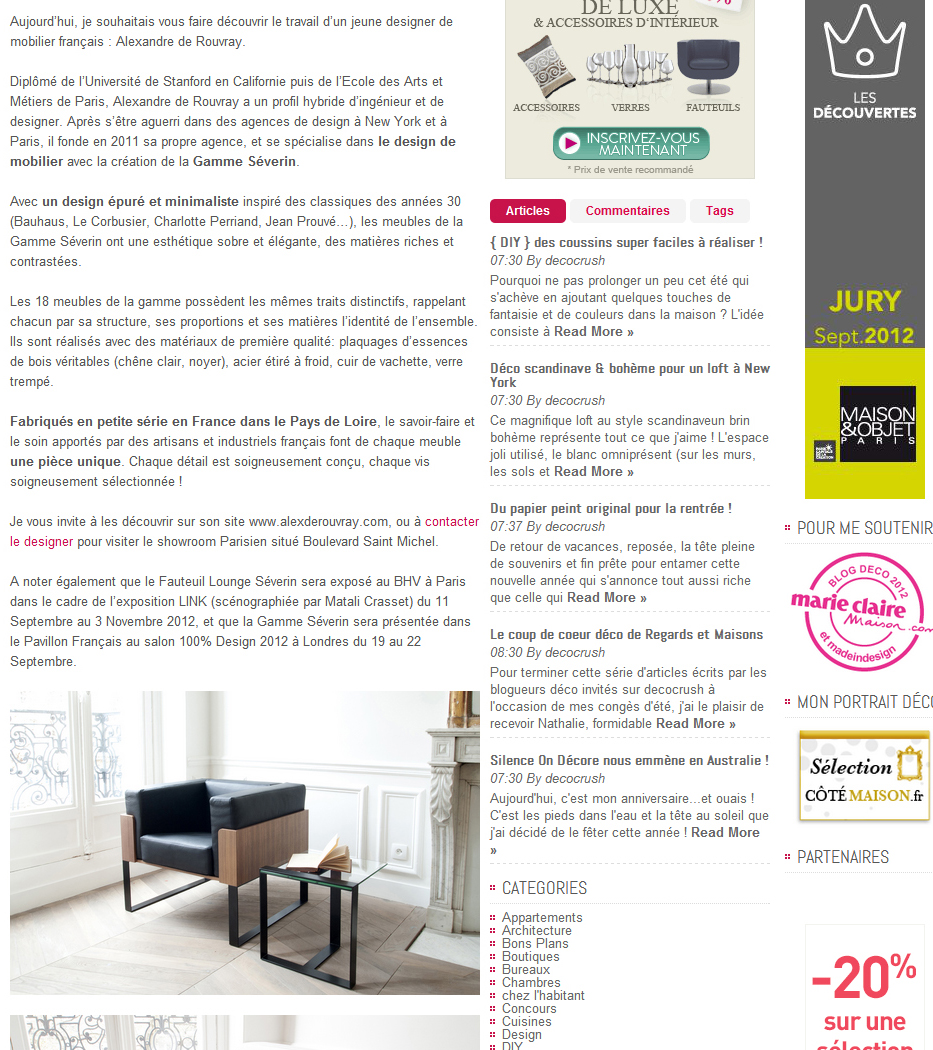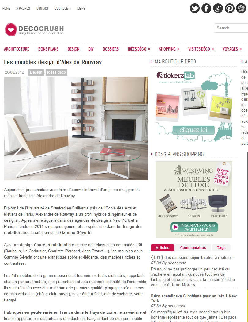 Le blog de décoration et de design DECO CRUSH a consacré un article à Alex de Rouvray Design en août 2012: