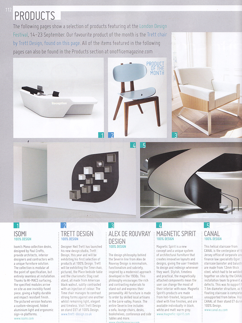 ON OFFICE Alex de Rouvray Design dans le magazine anglais OnOFFICE en Octobre 2012! OnOFFICE a retenu Alex de Rouvray Design dans sa sélection des produits les plus influents du London Design Festival. Read more Read more Précédent Suivant